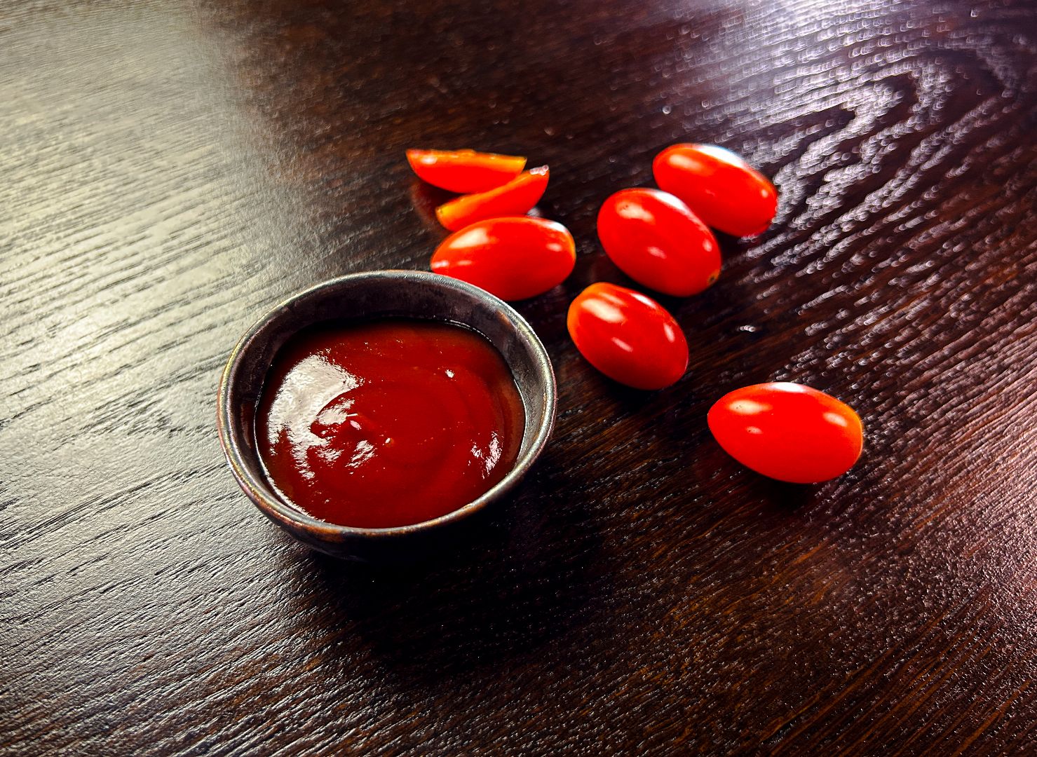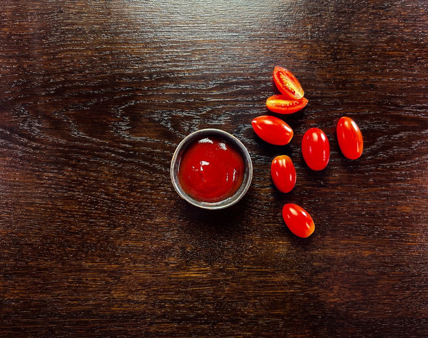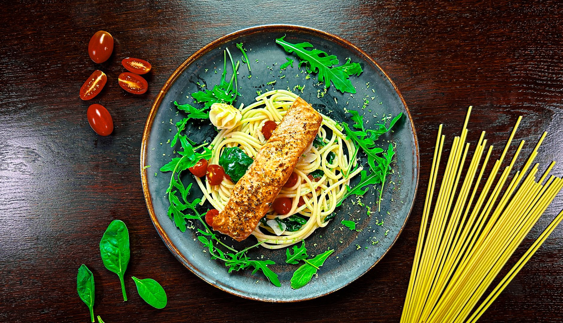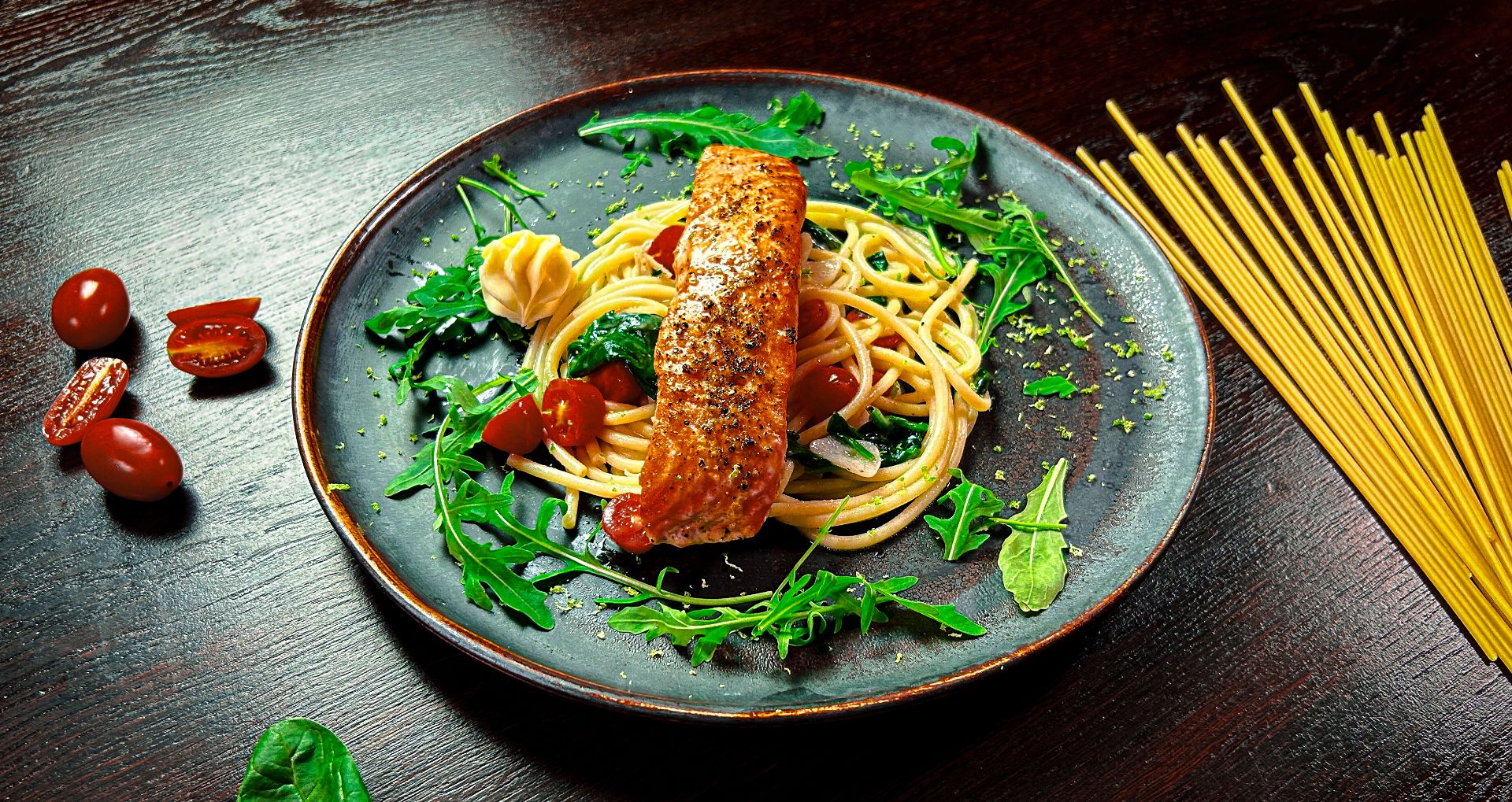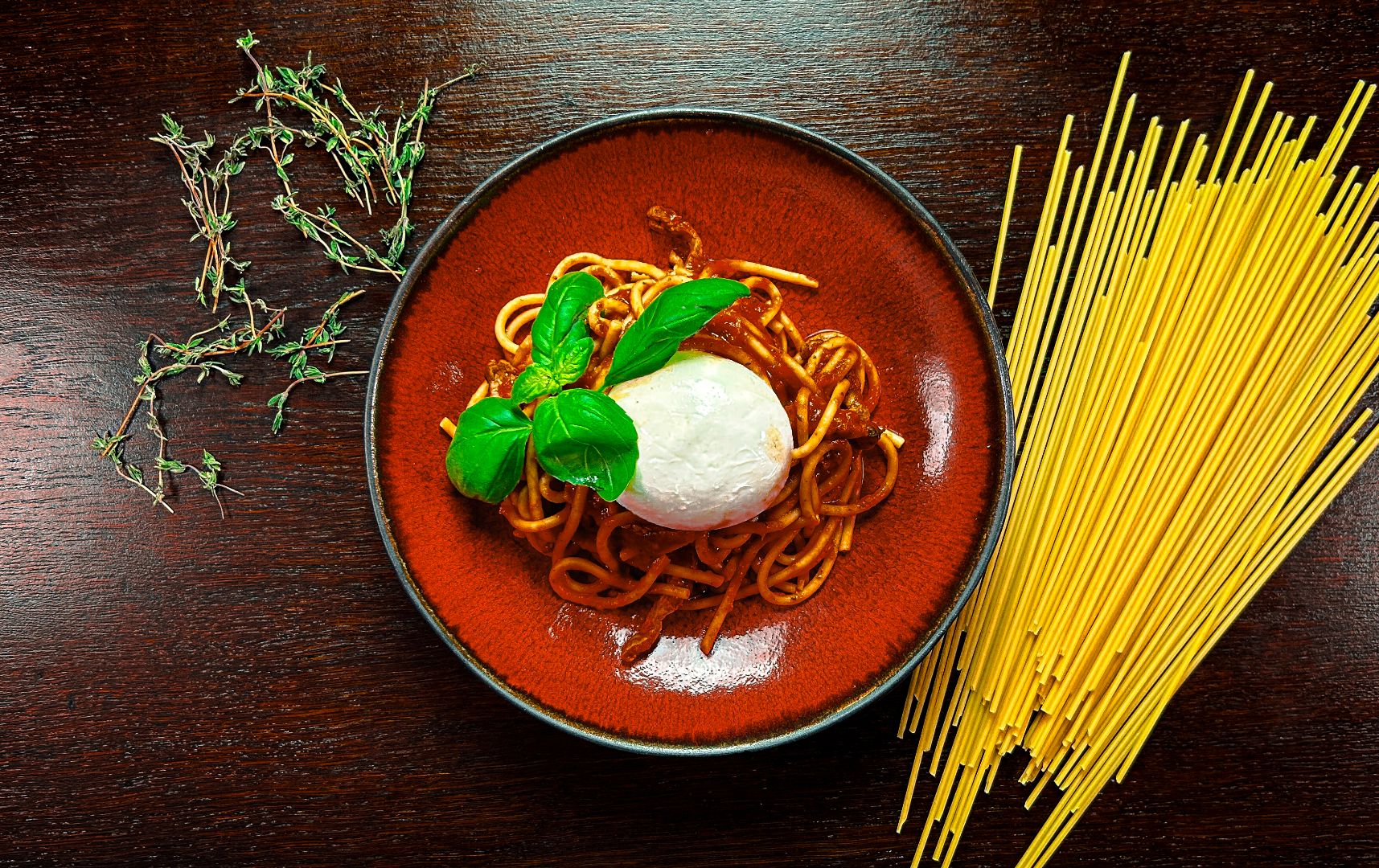 makaron bucatini, sos pomidorowy, pomidorki cherry