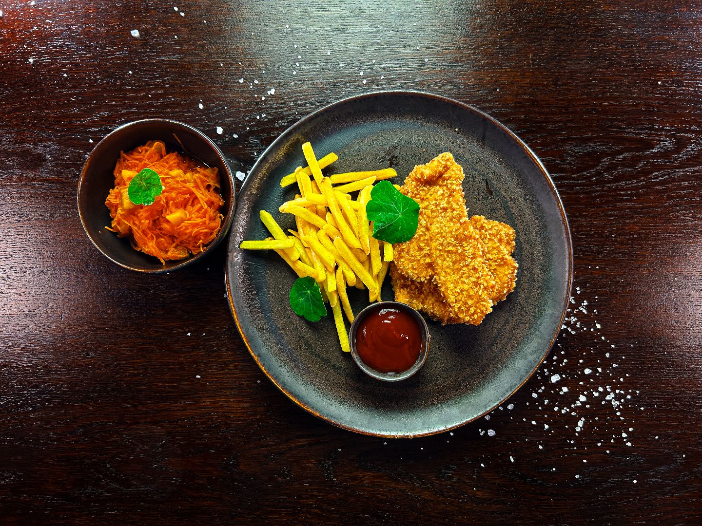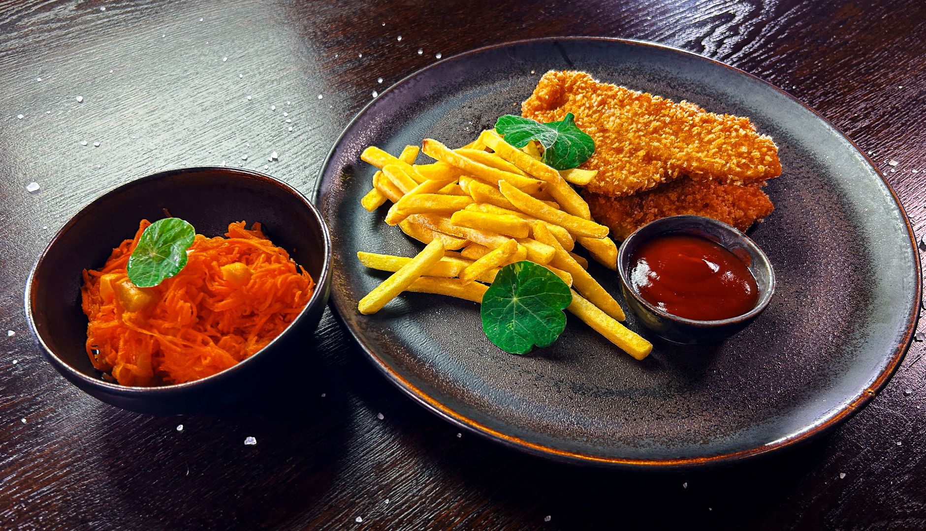 podane z frytkami i surówką z marchewki z brzoskwinią