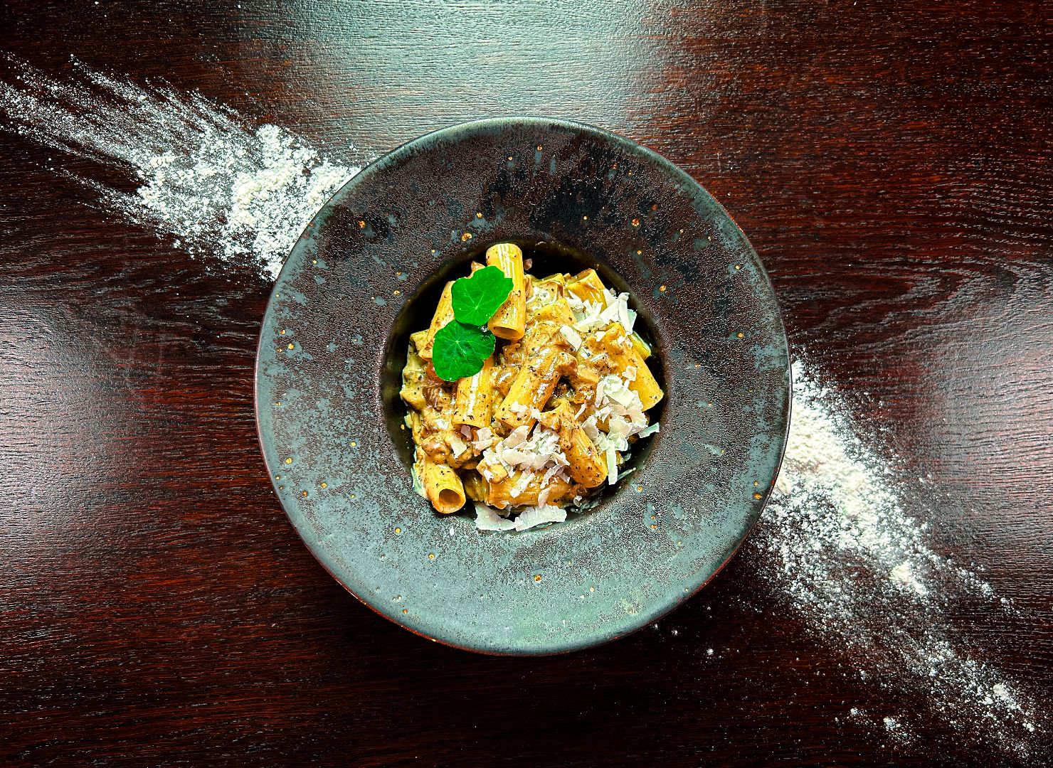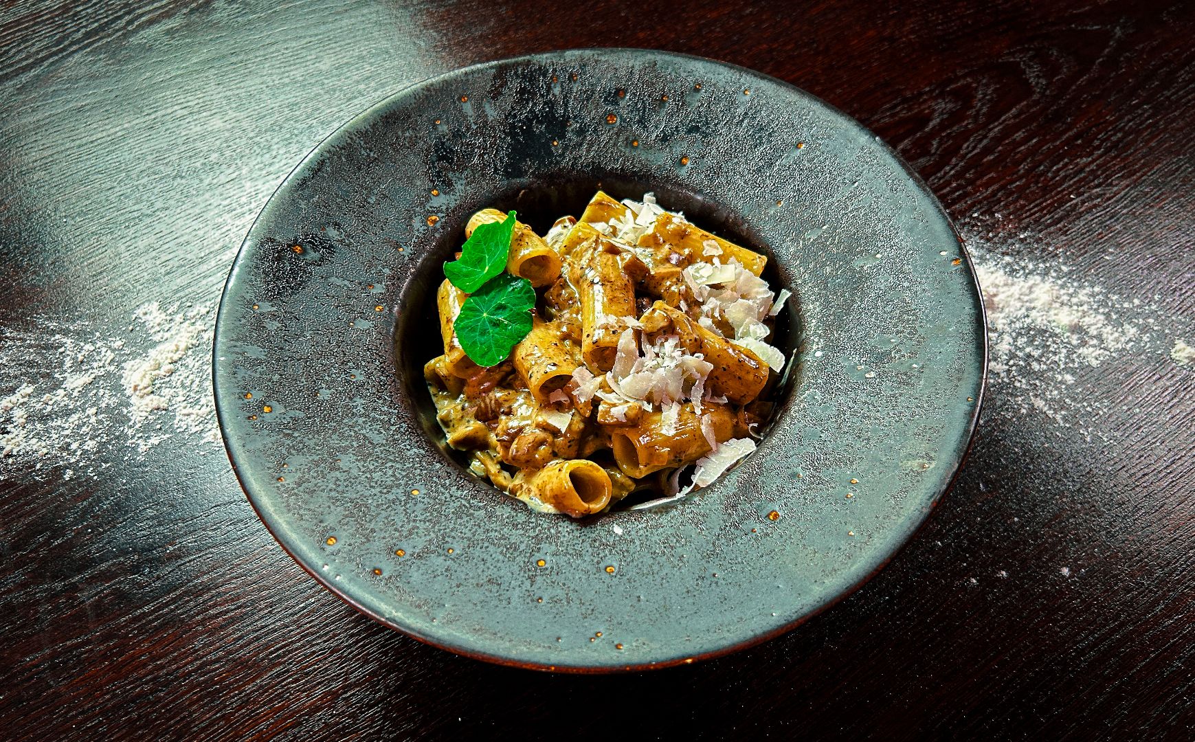 makaron rigatoni, borowiki, trufle, śmietana, parmezan