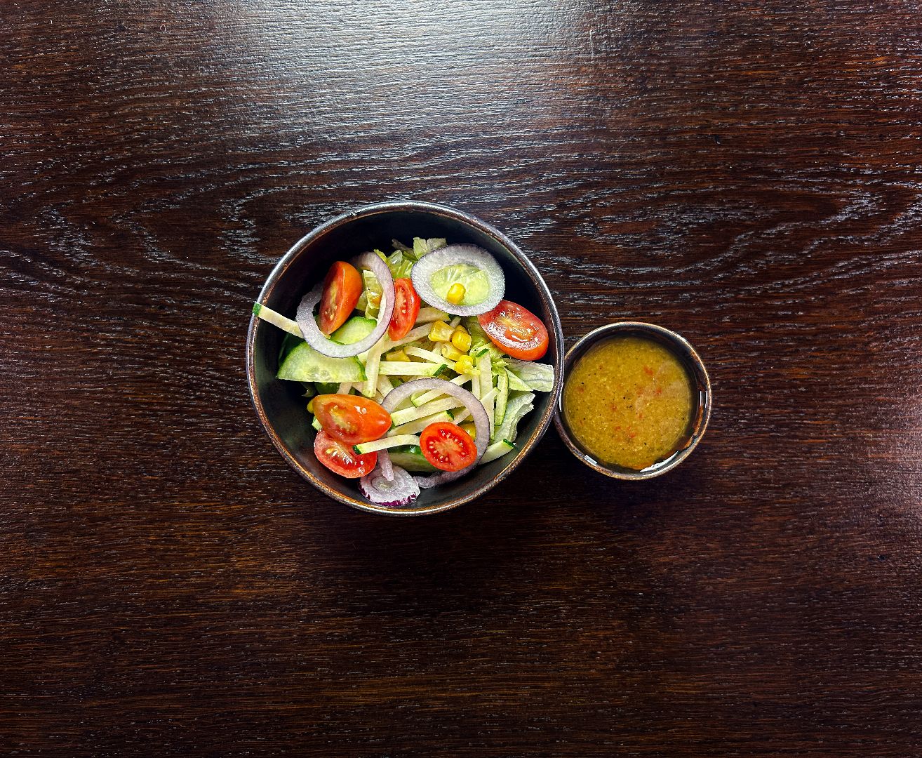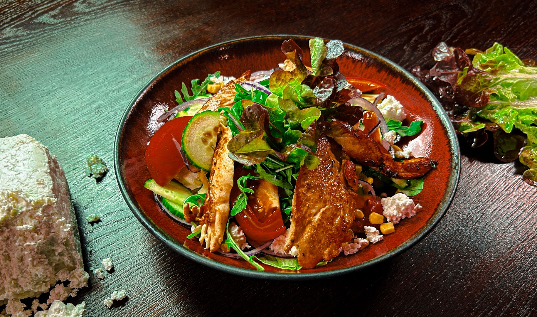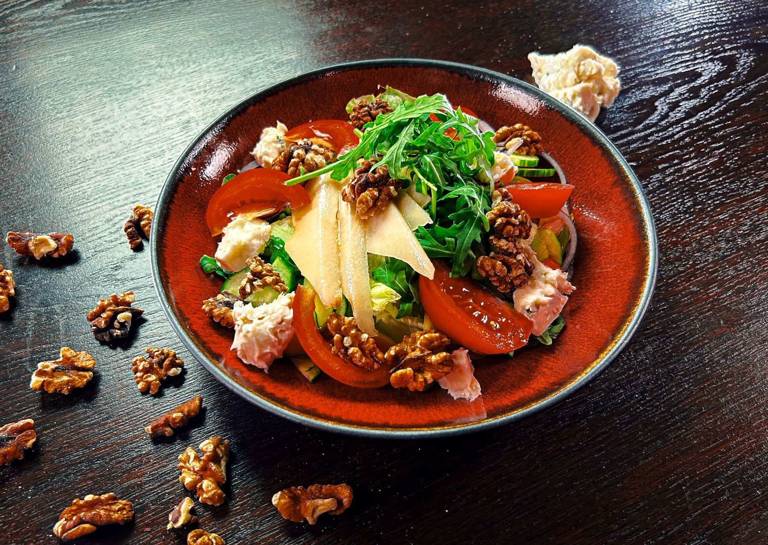 podana z czerwoną cebulą, pomidorem i ogórkiem, rukolą lub szpinakiem i sosem miodowo - cytrusowym (na życzenie z orzechami włoskimi)