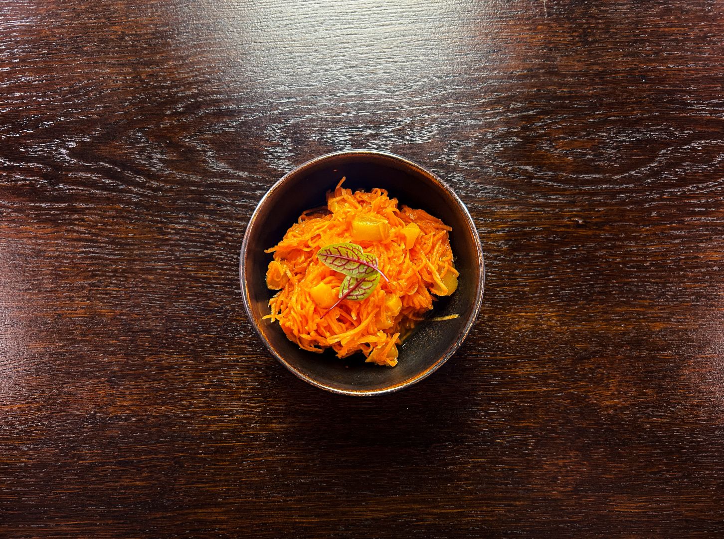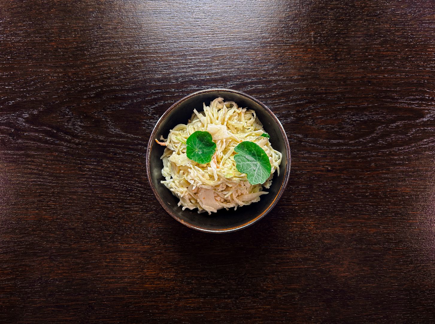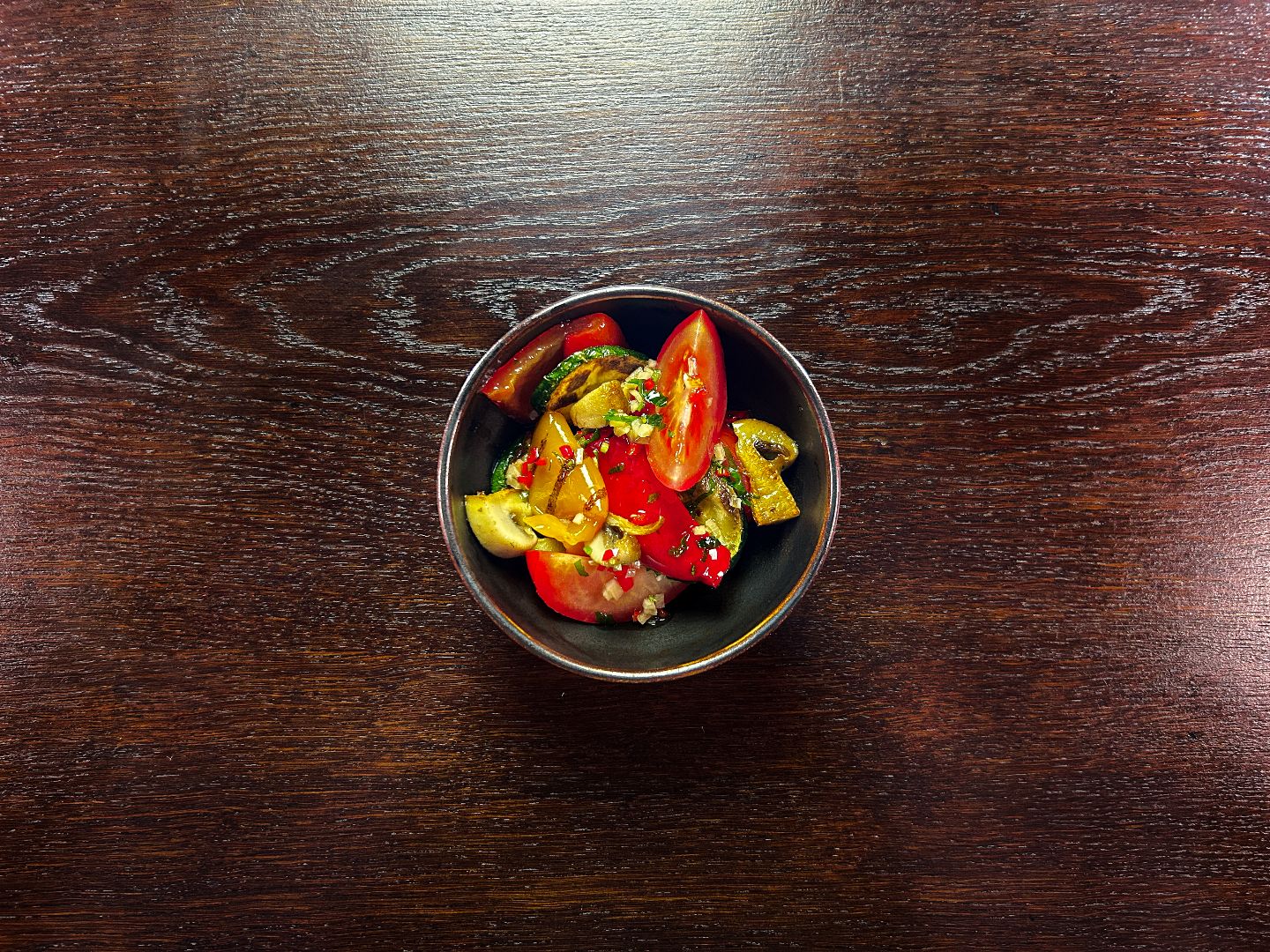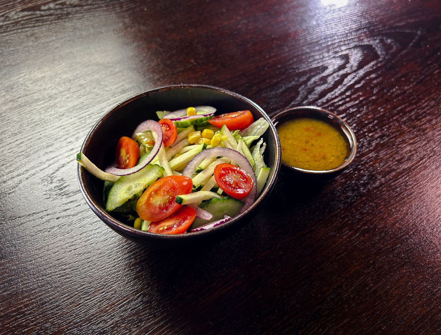 podana z czerwoną cebulą, pomidorem i ogórkiem, rukolą lub szpinakiem i sosem miodowo - cytrusowym (na życzenie z orzechami włoskimi)