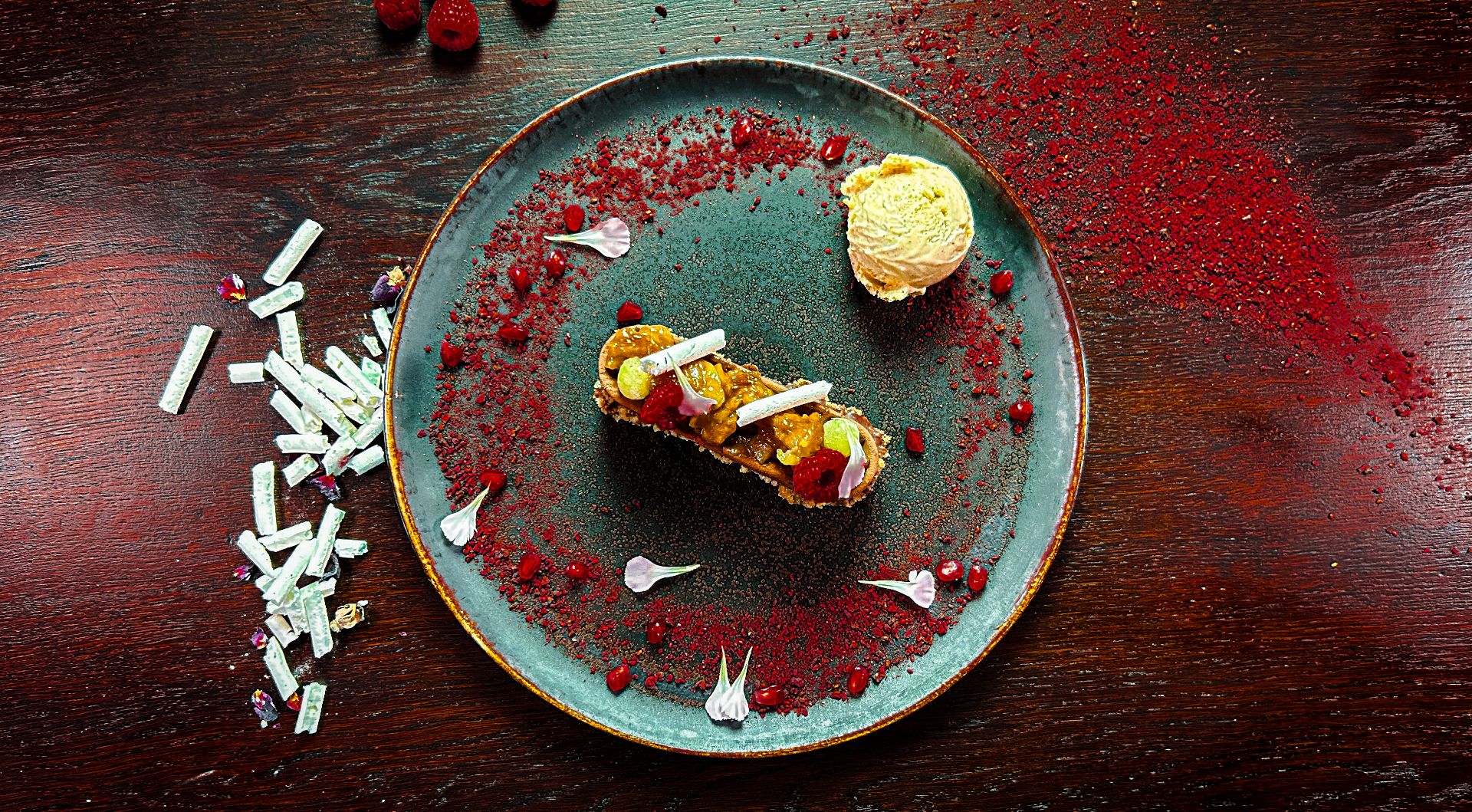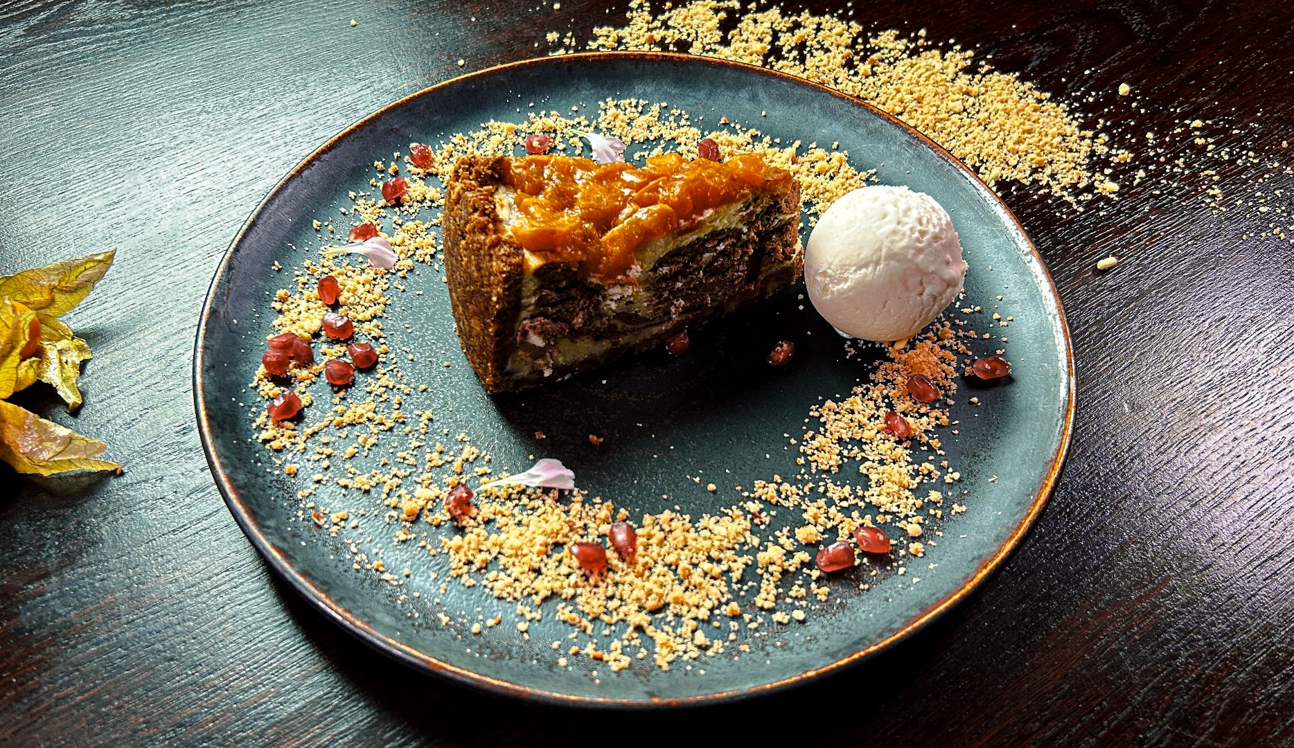 z przyprawami korzennymi, podany z lodami jogurtowo-cytrynowymi i konturą z moreli