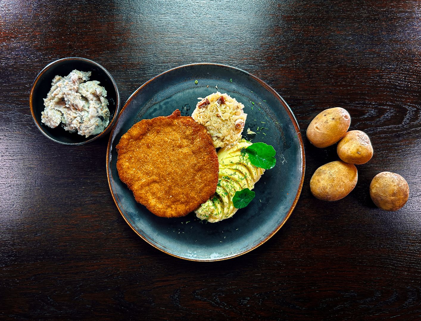 podany z ziemniakami puree i kiszoną kapustą zasmażaną