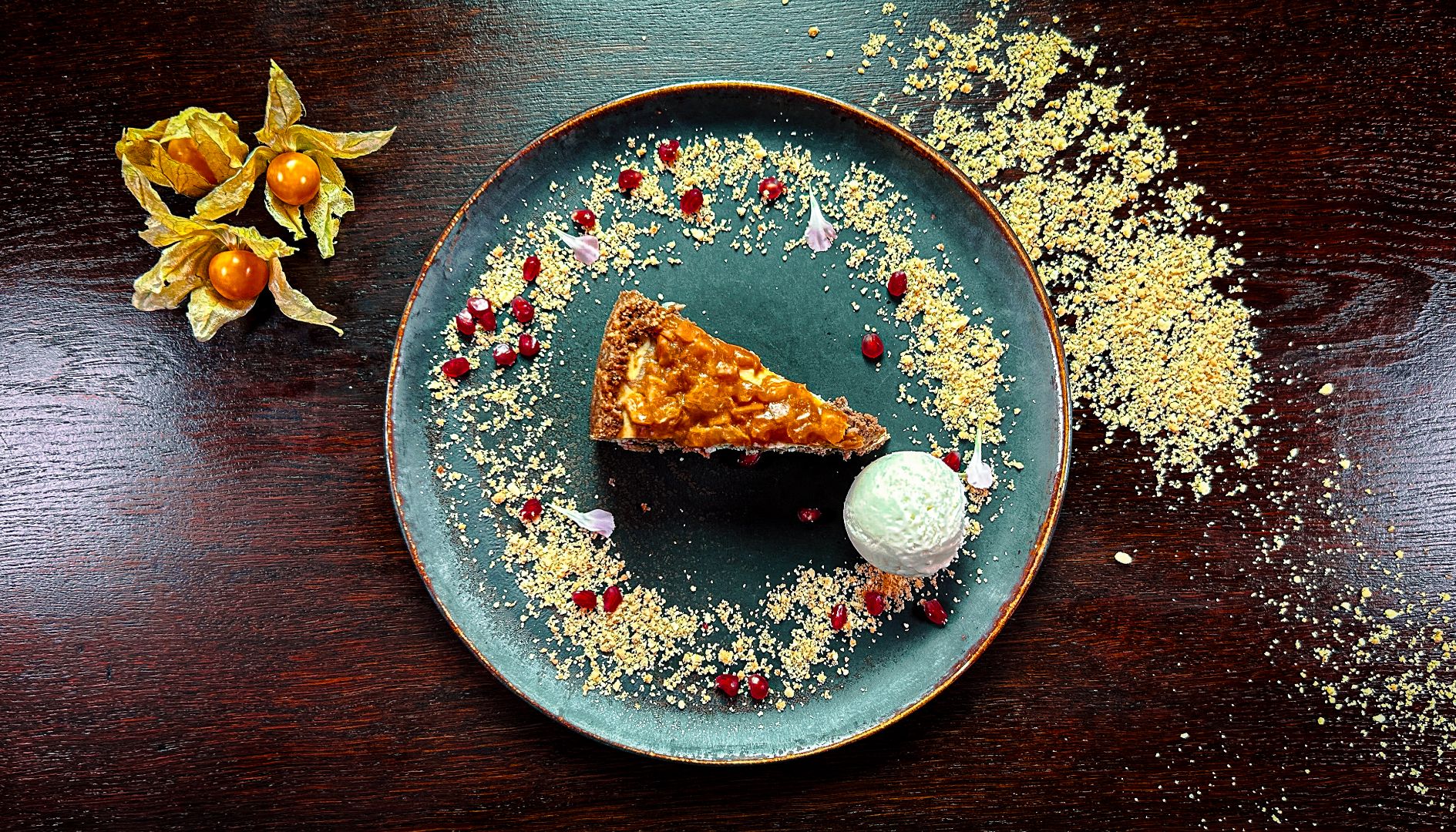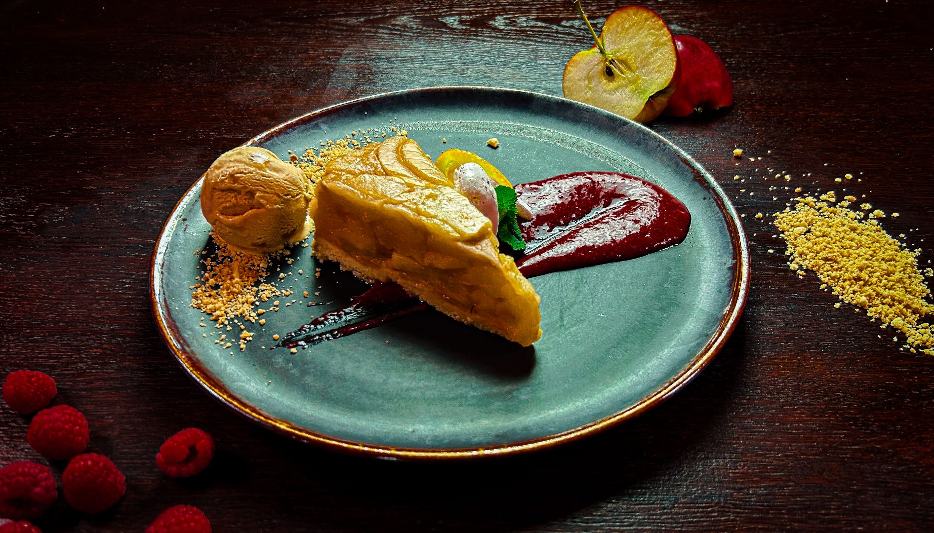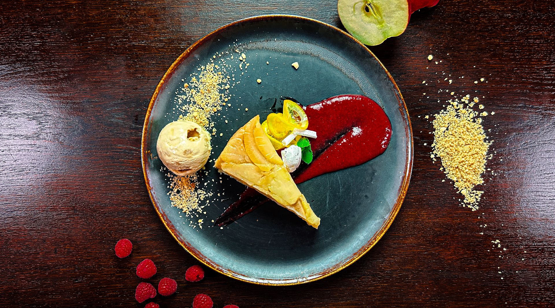 karmelizowane jabłka na kruchym spodzie, puder maślany, mrożony mus karmelowy,