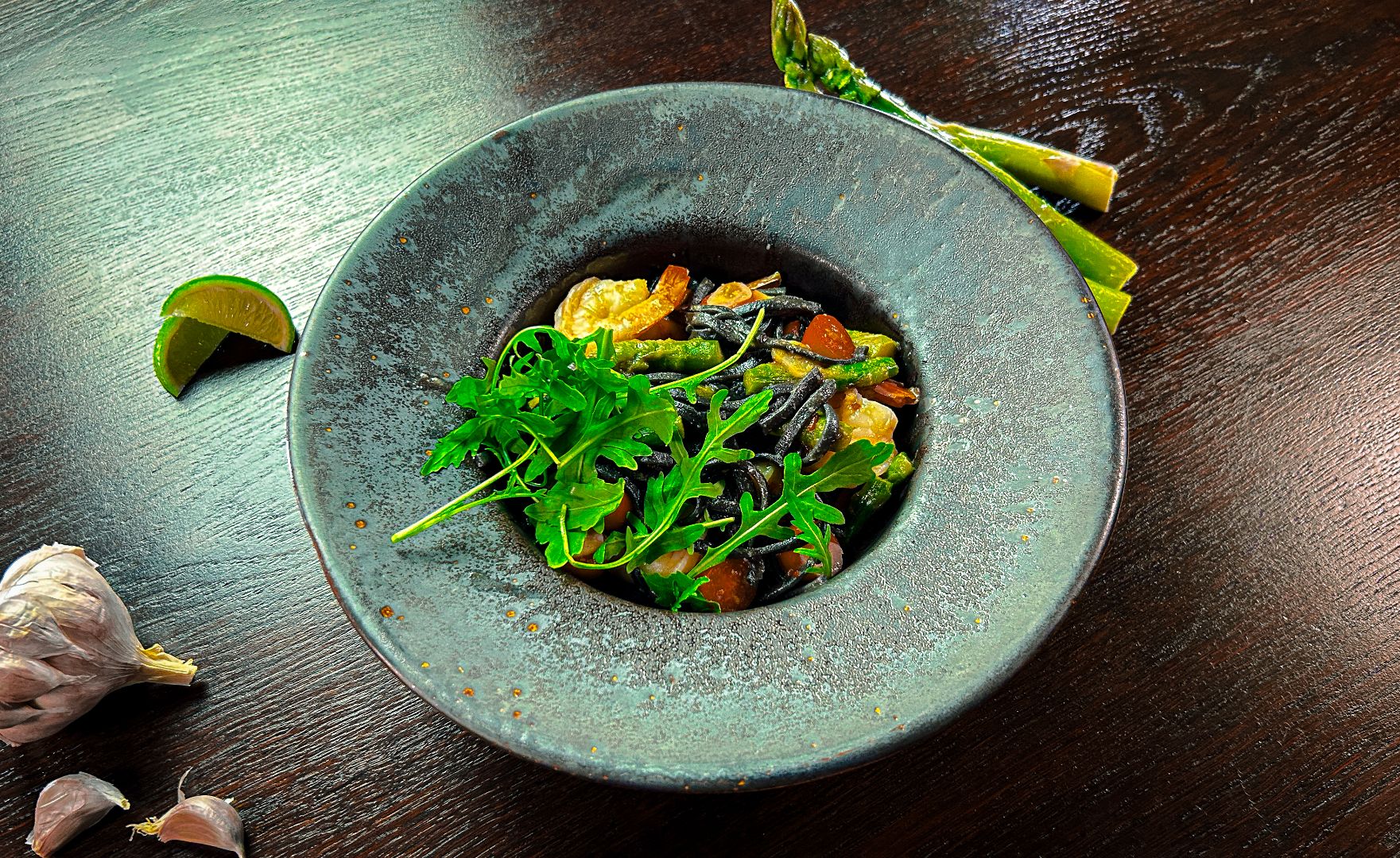 makaron tagliolini di seppia, krewetki królewskie (6 szt.), trawa cytrynowa,