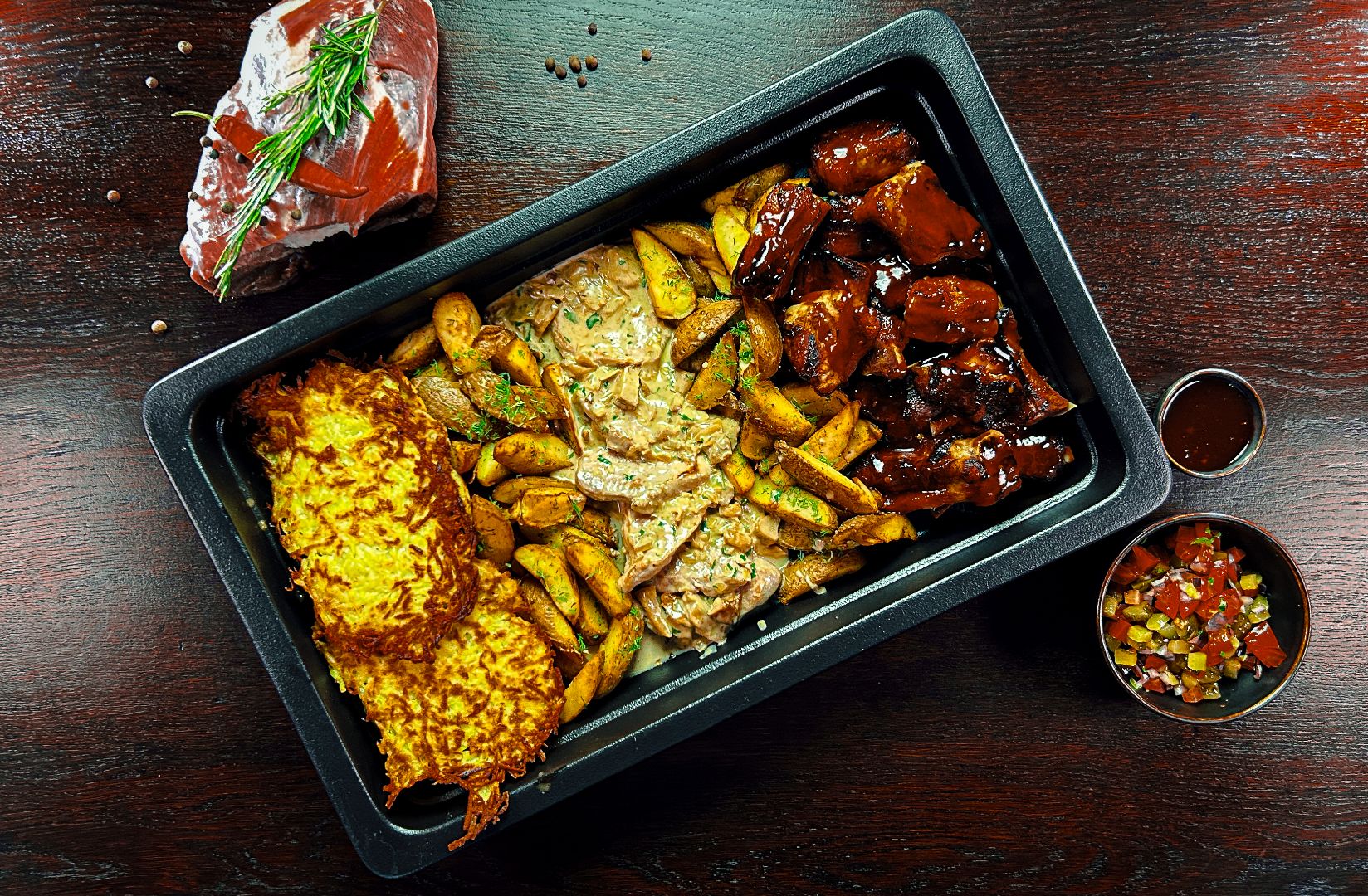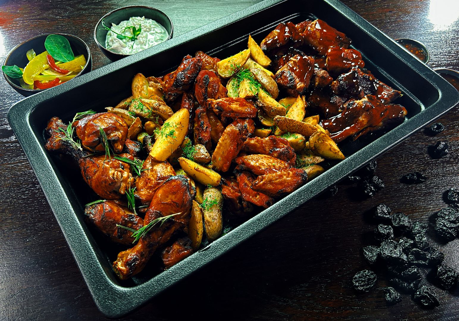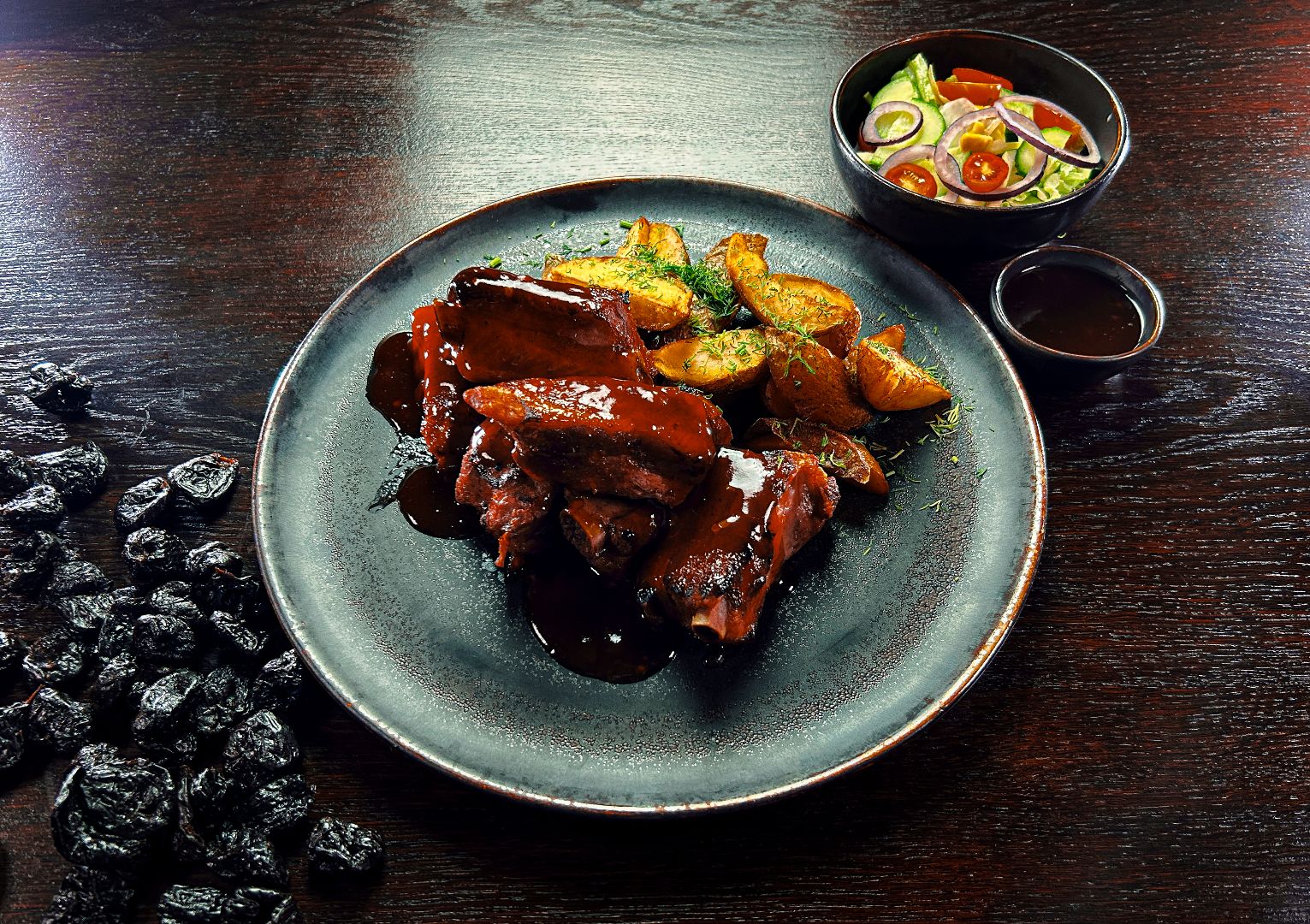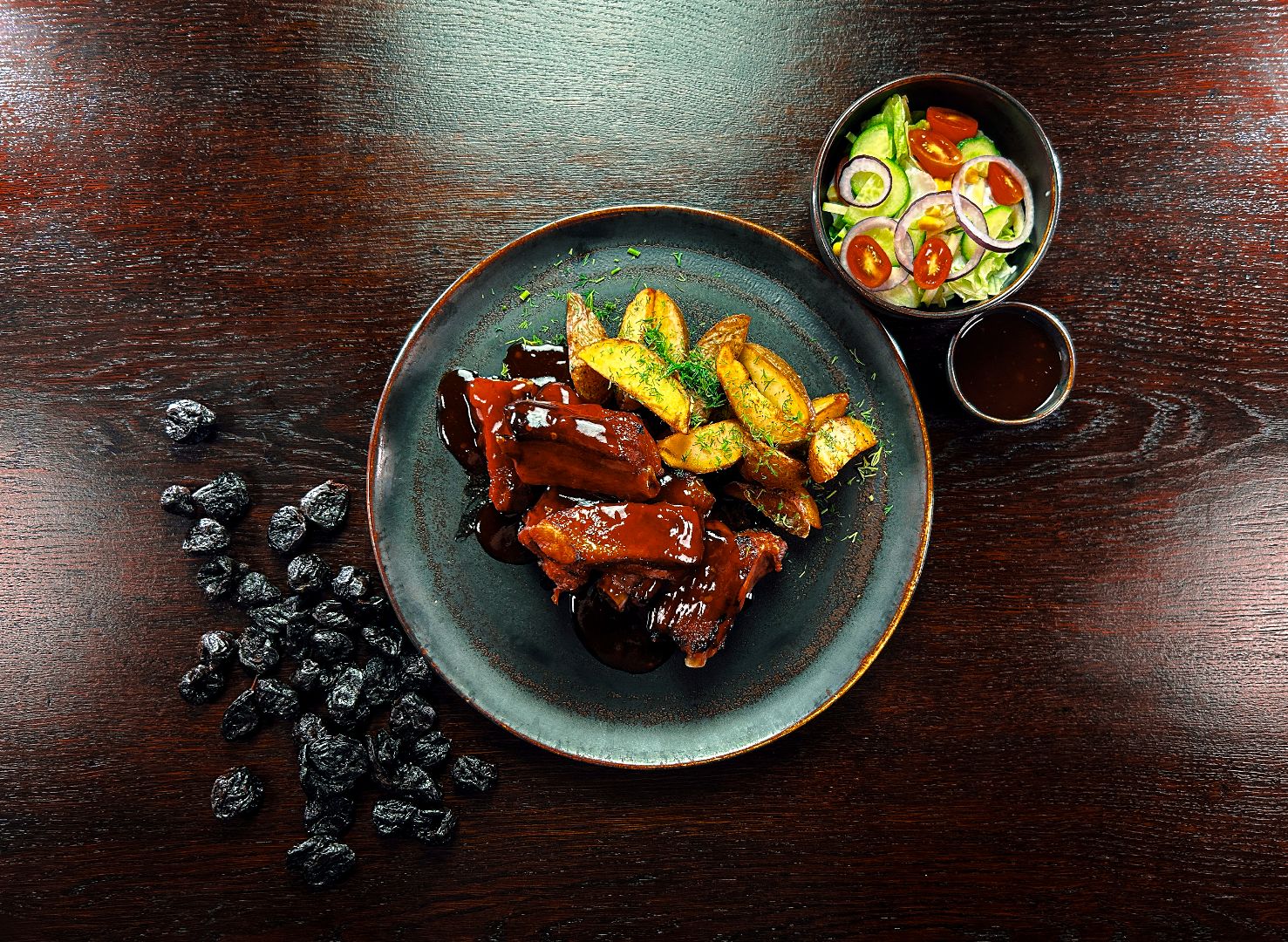 pieczone pikantne żeberka z sosem BBQ i chilli, podane z pieczonymi ziemniakami i mixem sałat z sosem Ranch