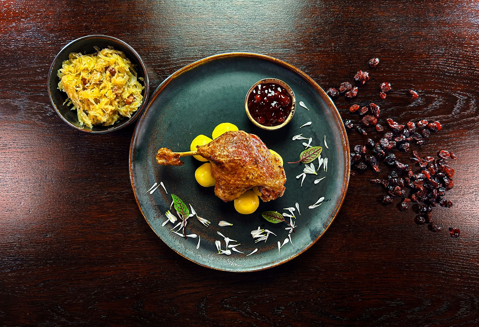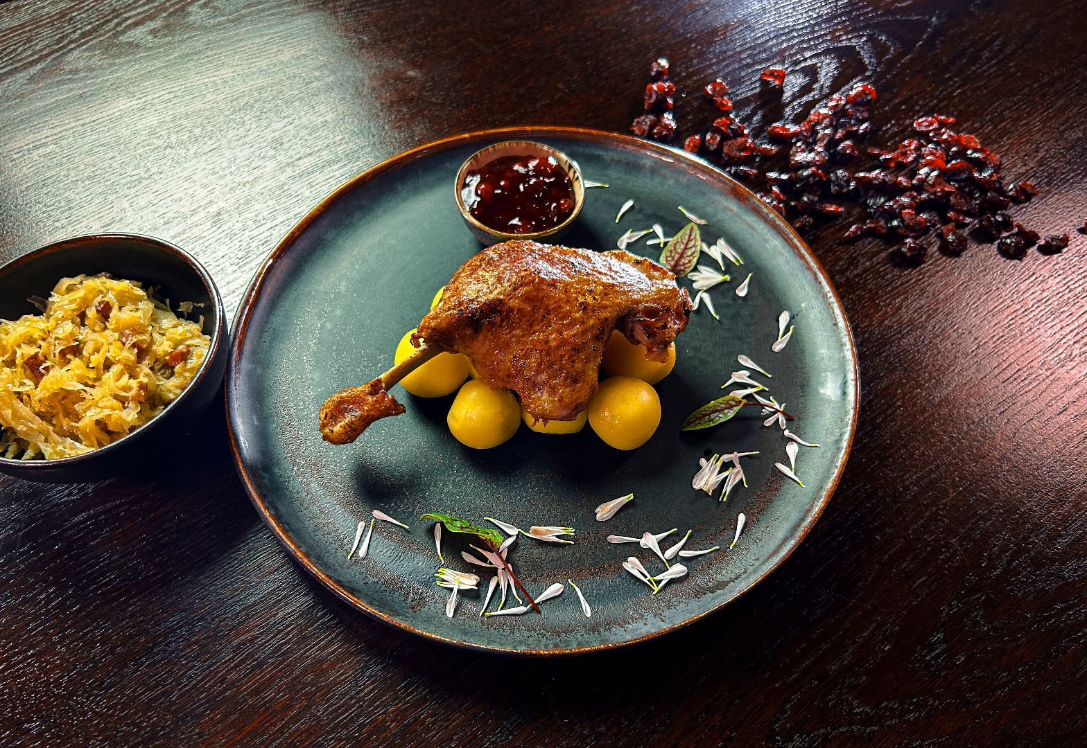 podane na sosie własnym, z konfiturą z żurawiny, białymi kluskami i sałatką z gotowanych buraczków z jabłkiem i cebulą