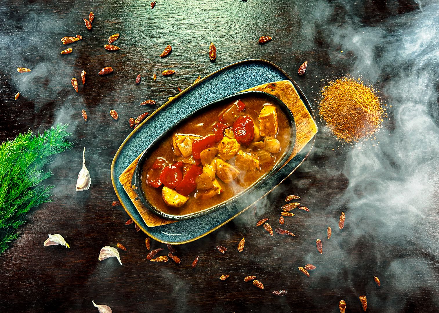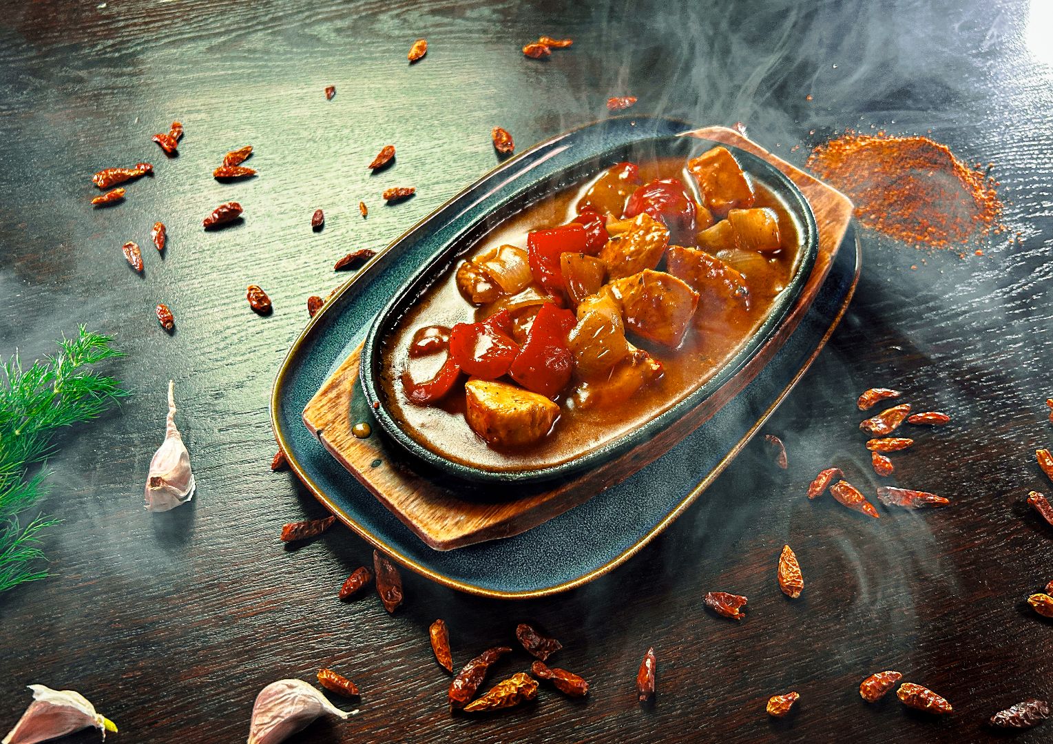 gorący rondel z kawałkami kurczaka, papryki i cebuli w aromatycznym sosie z mieszanką oryginalnych przypraw, podany z mixem sałat z sosem vinegrette i ryżem jasminowym