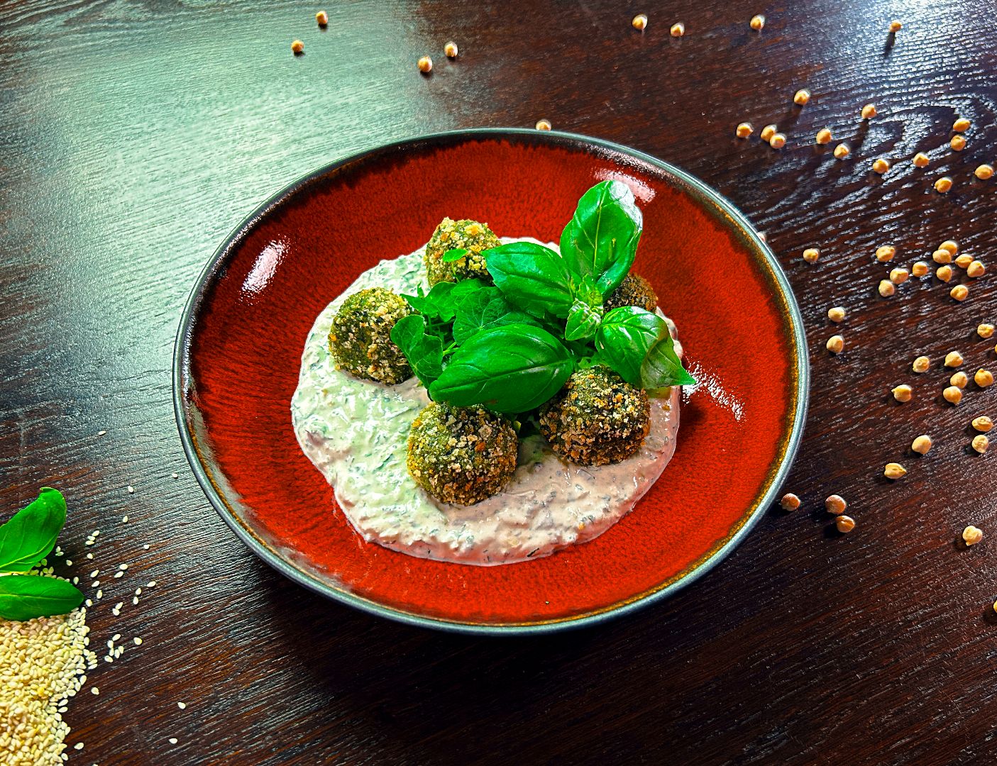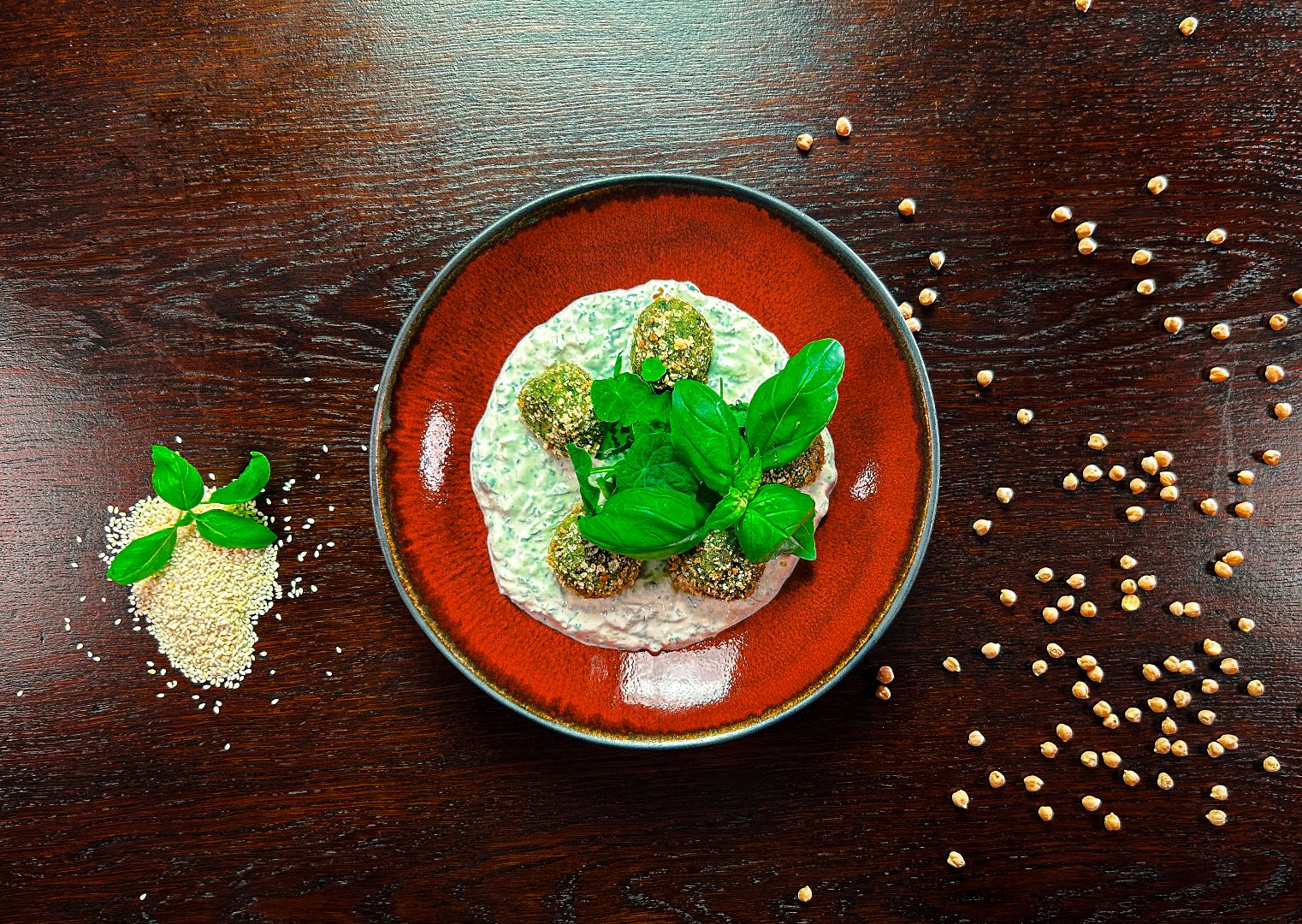 podany na baba ghanoush (puree) z cukinii z kolendrą, miętą i limonką