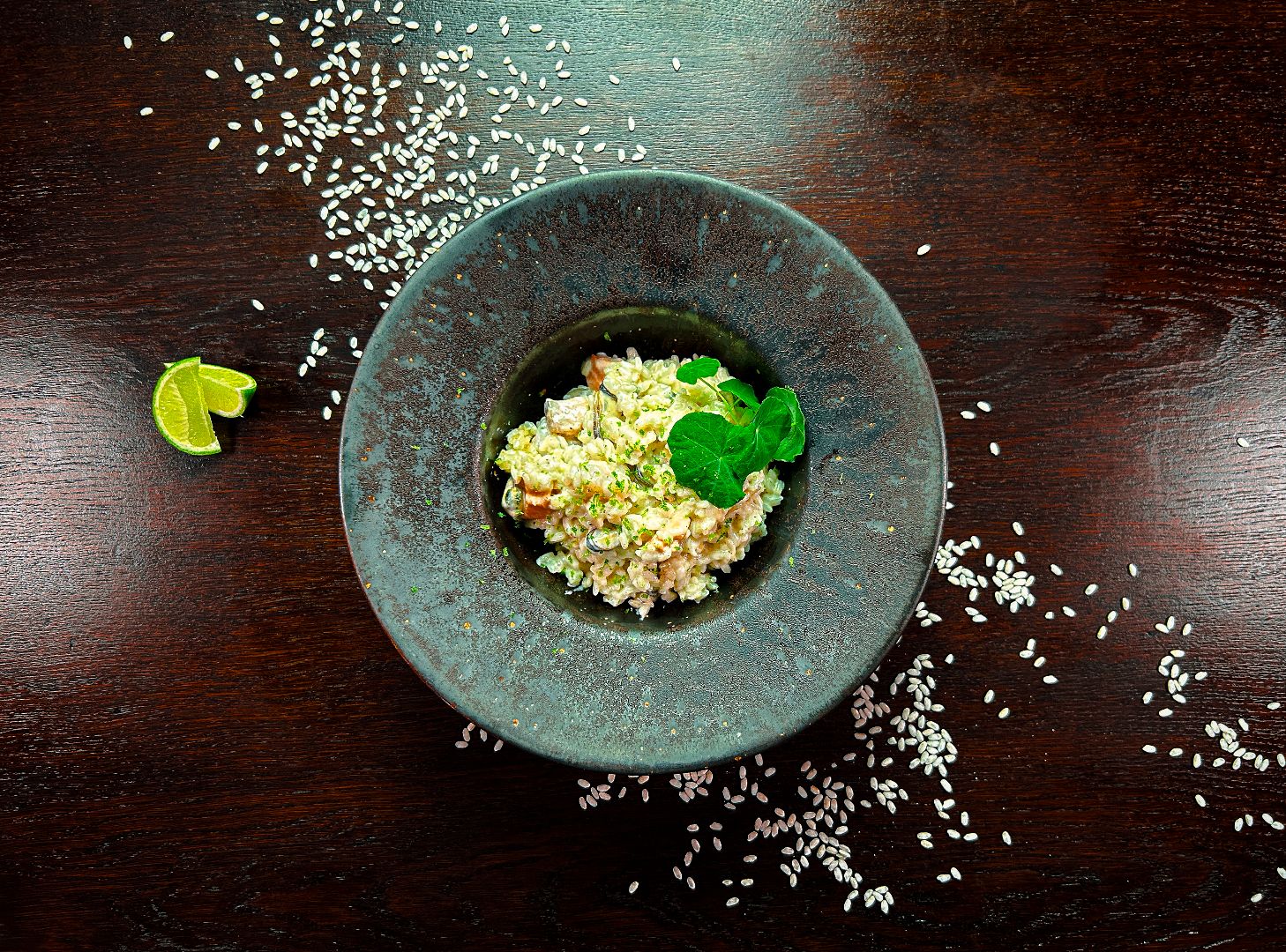 ryż Arborio, krewetki królewskie (6 szt), mięso małży, łosoś norweski, białe wino