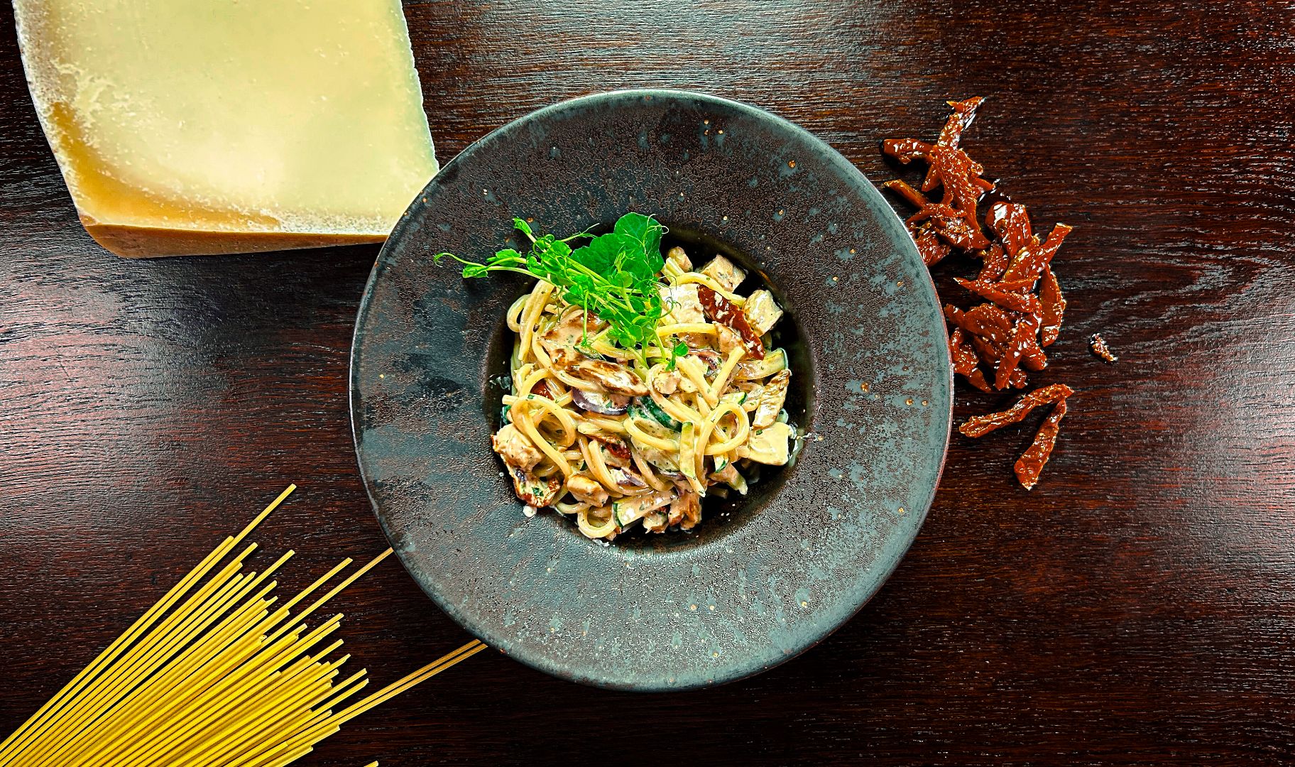 makaron bucatini, suszone pomidory, cukinia, czerwona cebula,
