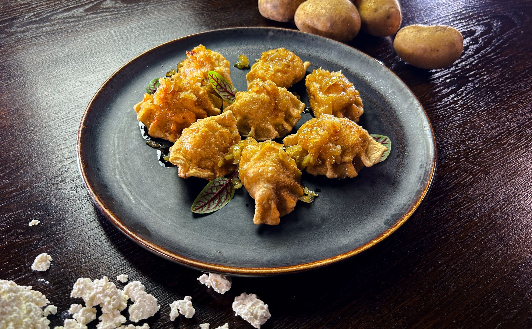 z ziemniakami i białym serem, polane masłem i cebulką