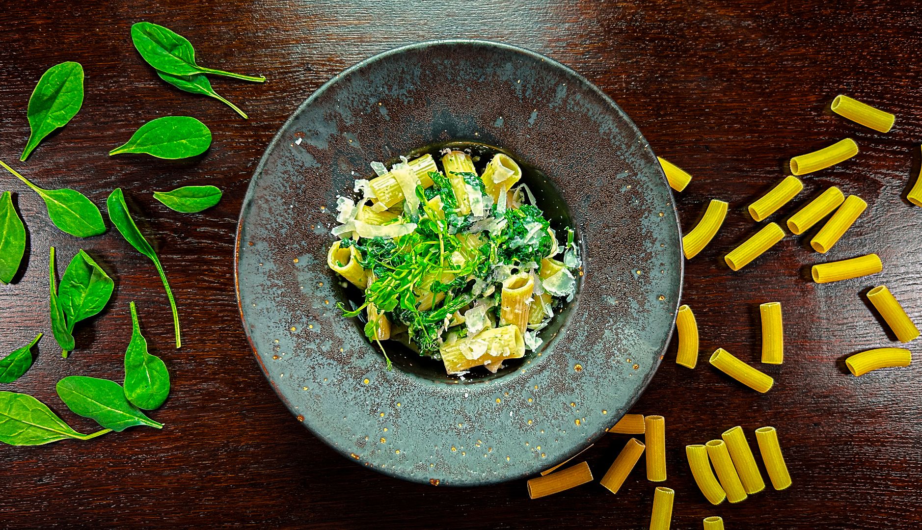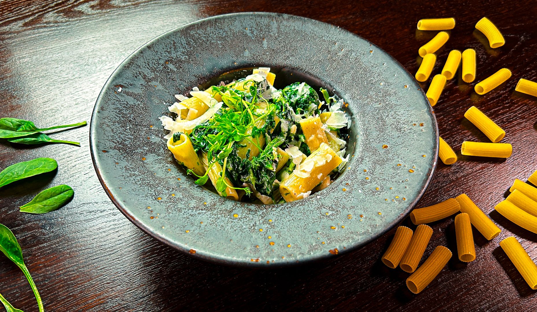 makaron rigatoni, szpinak, ser gorgonzola, czosnek, śmietana, parmezan