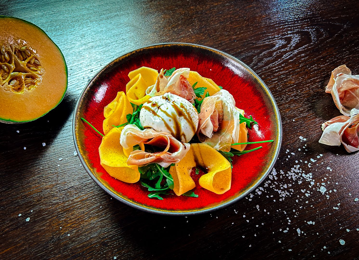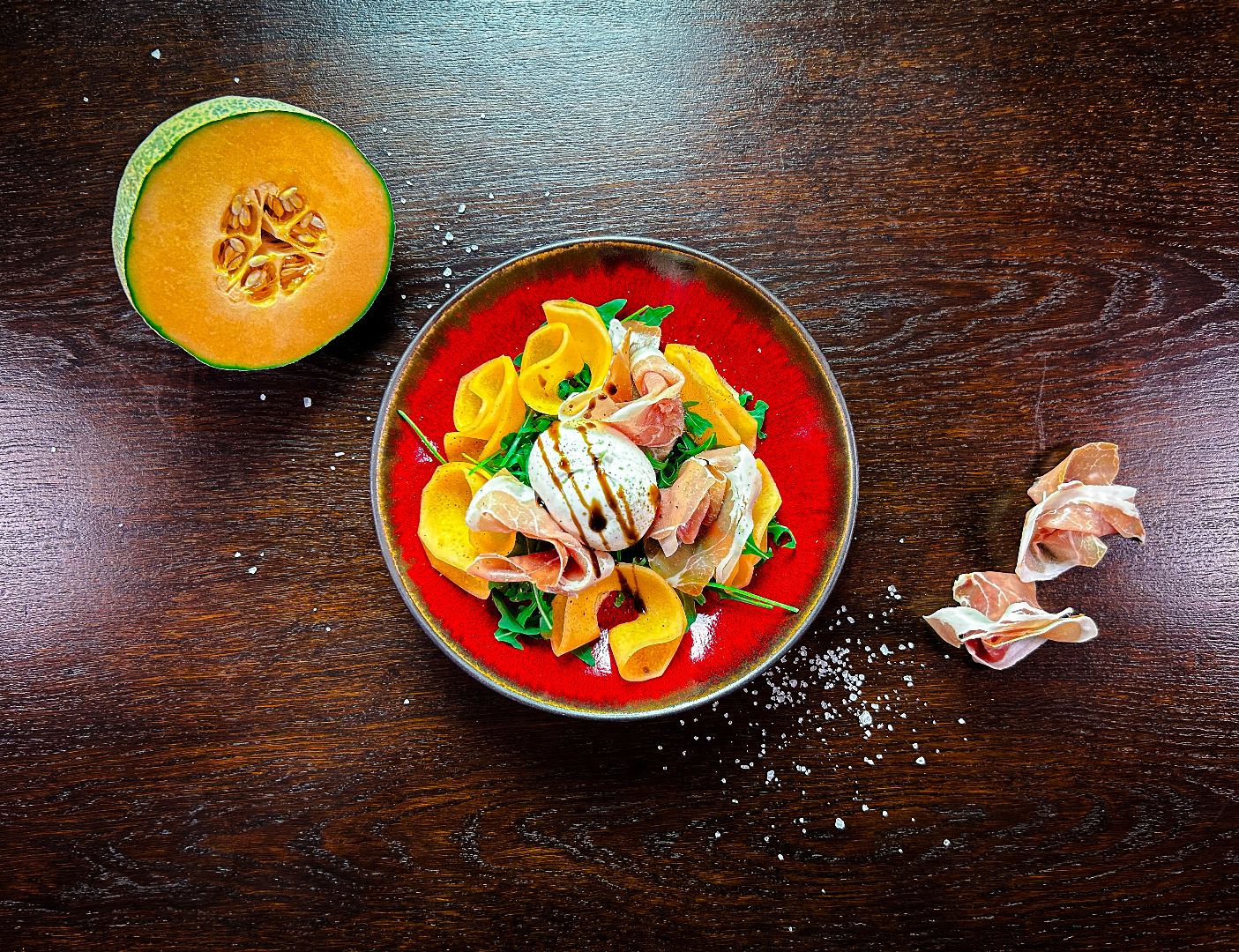 sałata rukola, melon, szynka włoska, burrata, oliwa extra virgin, krem balsamiczny