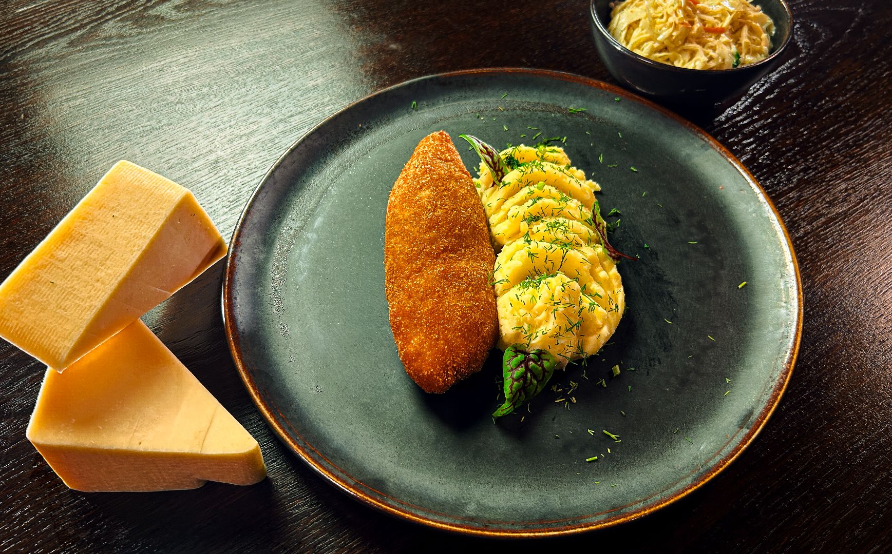podany z ziemniakami puree i sałatką Colesław